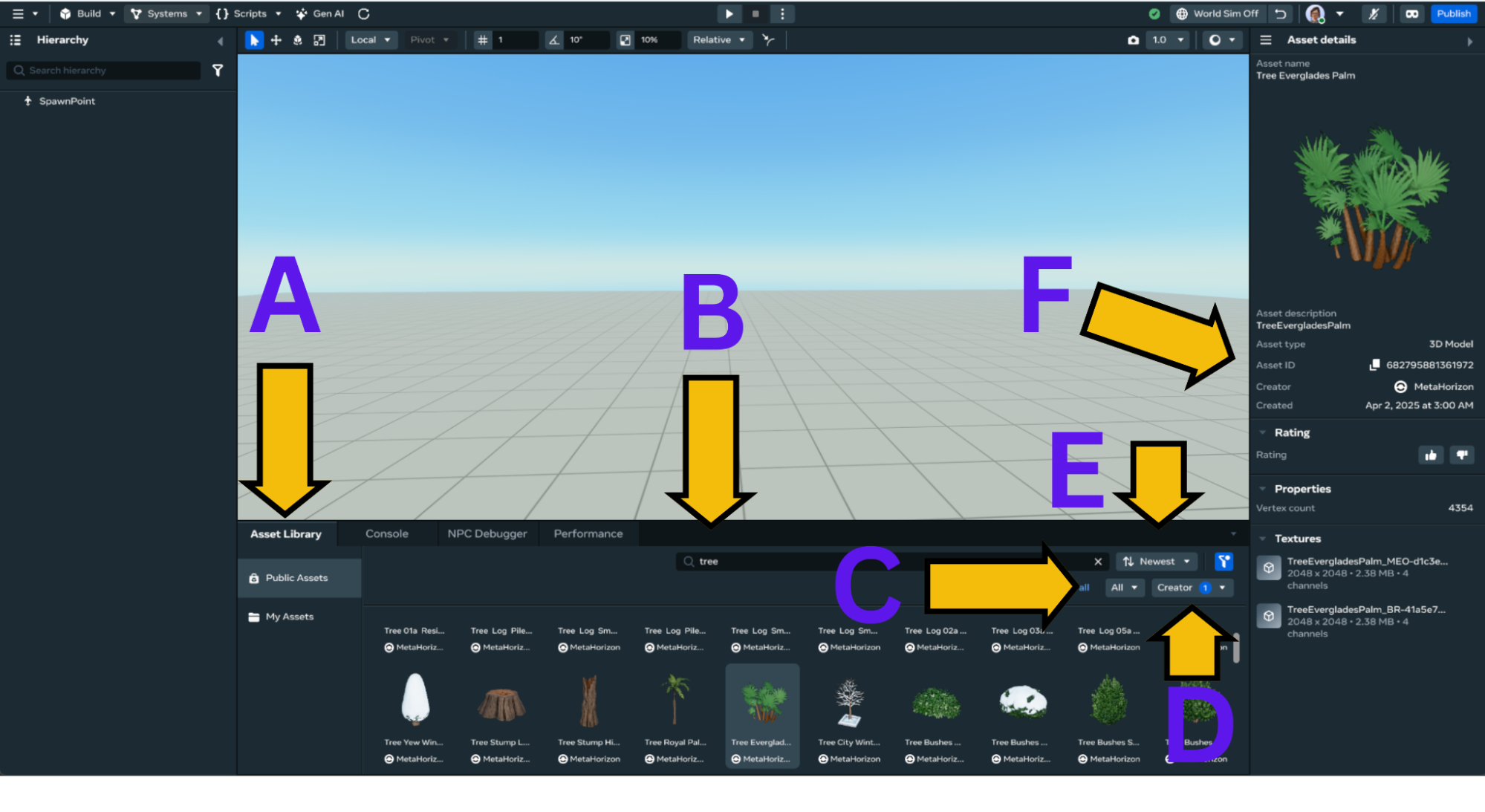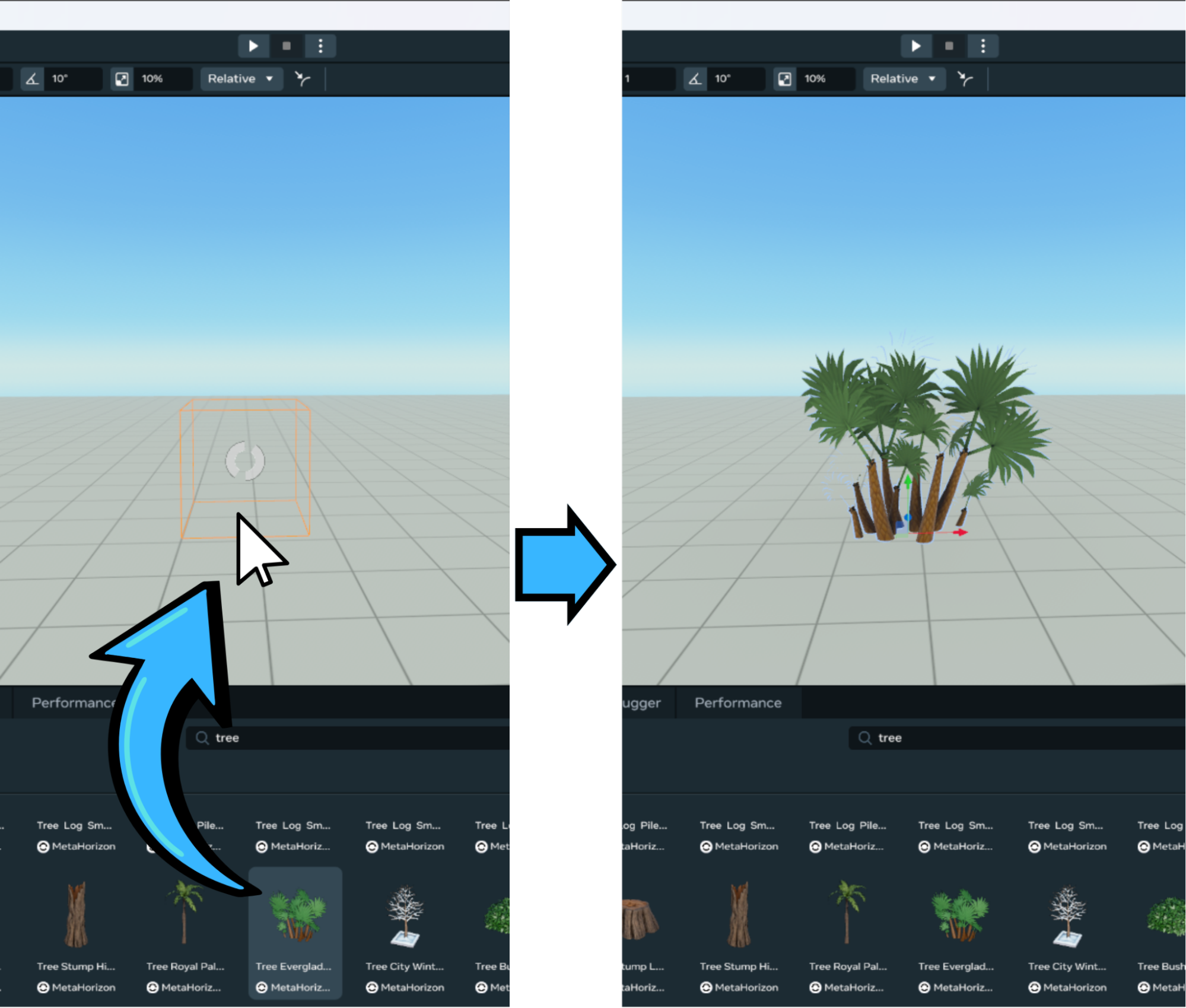 To use an asset in your world, simply drag and drop it into the scene: