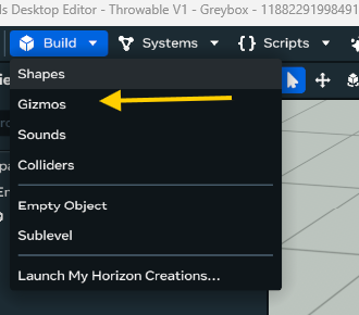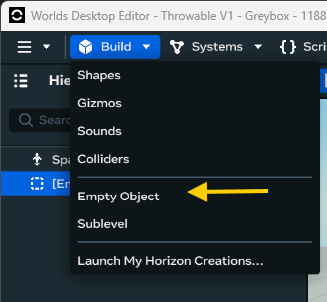 - From the Desktop Editor, go to the Build menu and select Empty Object