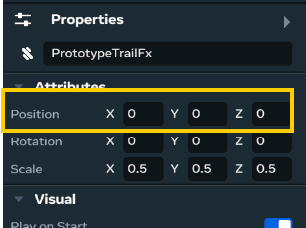 - With the trail effect still selected, go to the properties, and change its position to x:0, y: 0, z: 0