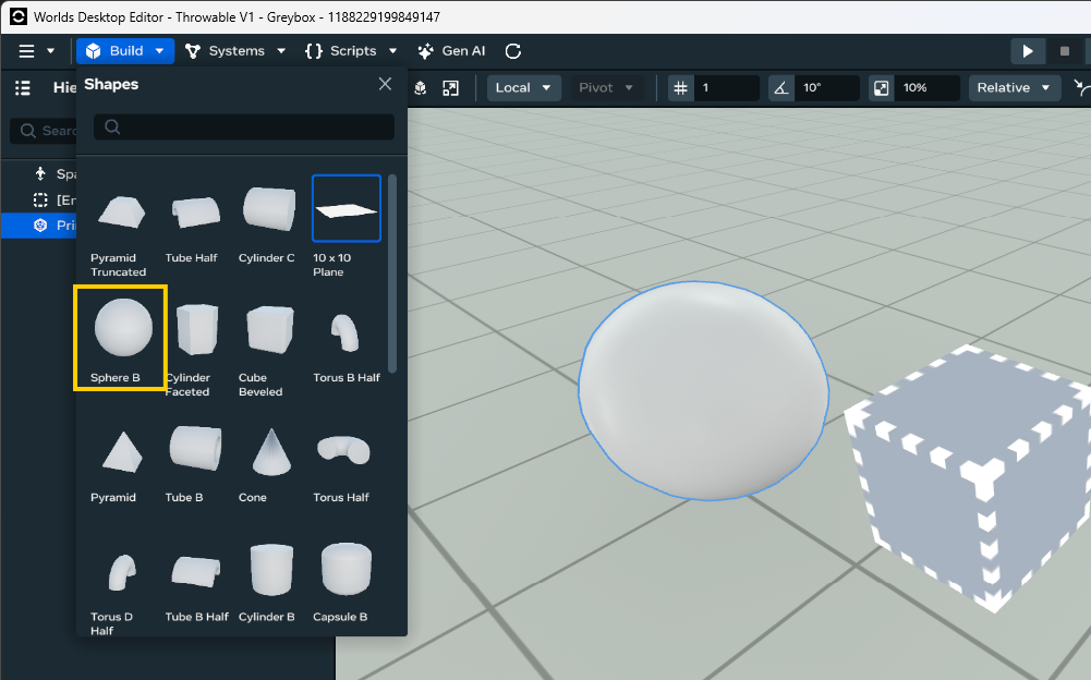 - Add a shape to the world, from Build > Shapes. We will be using a sphere for this example, by clicking on the shape and dragging it next to the empty