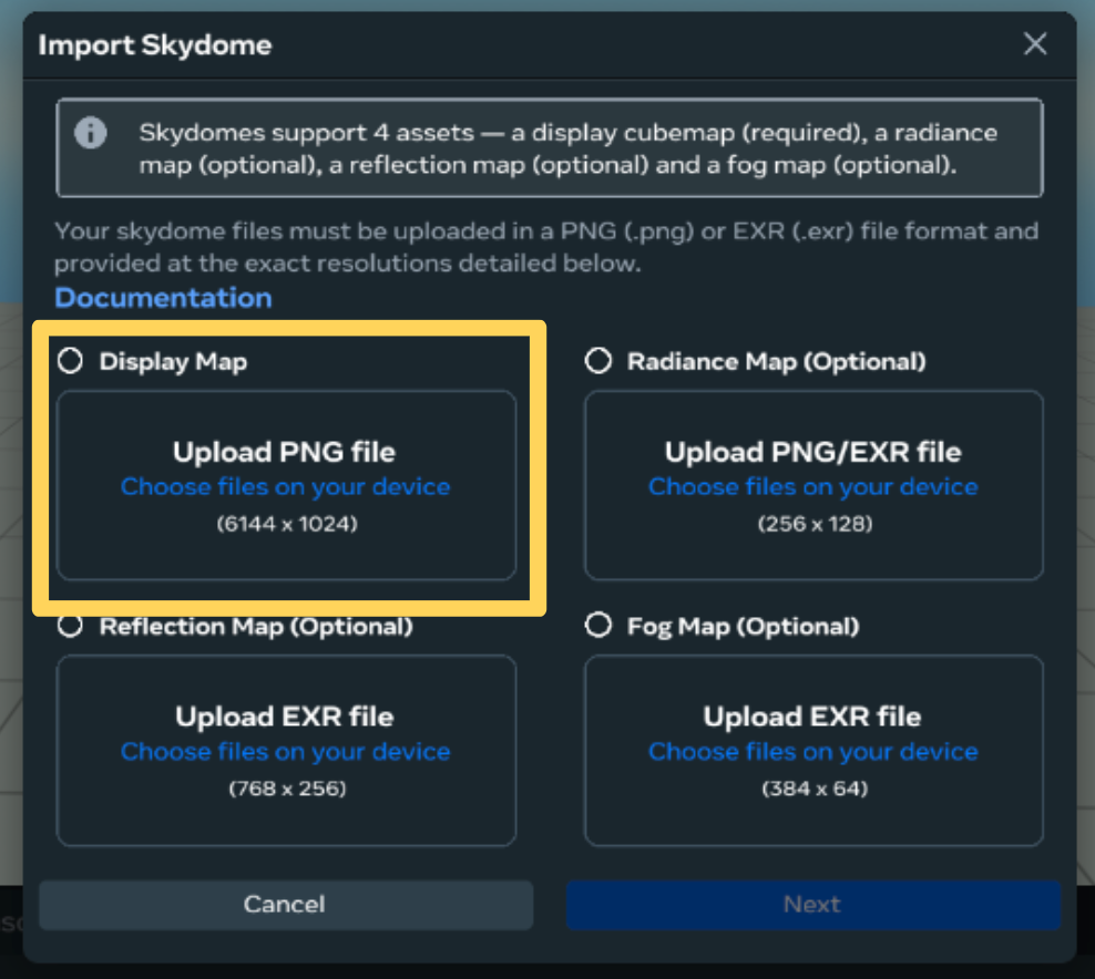 - Note: Custom skydomes have 4 components. The Display Map is the only component that is NOT optional