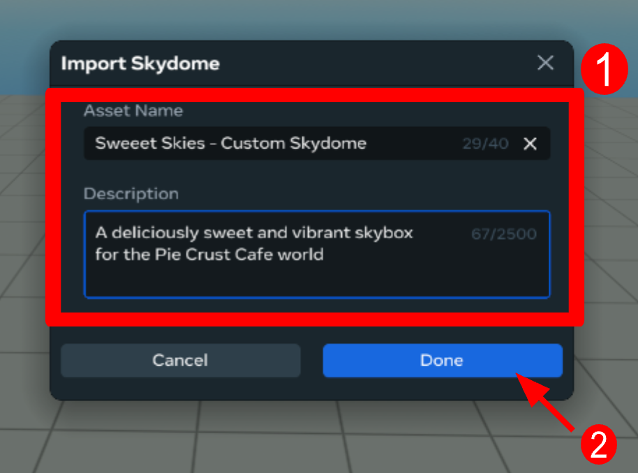- Provide a name and description for the skydome asset, then press Done
